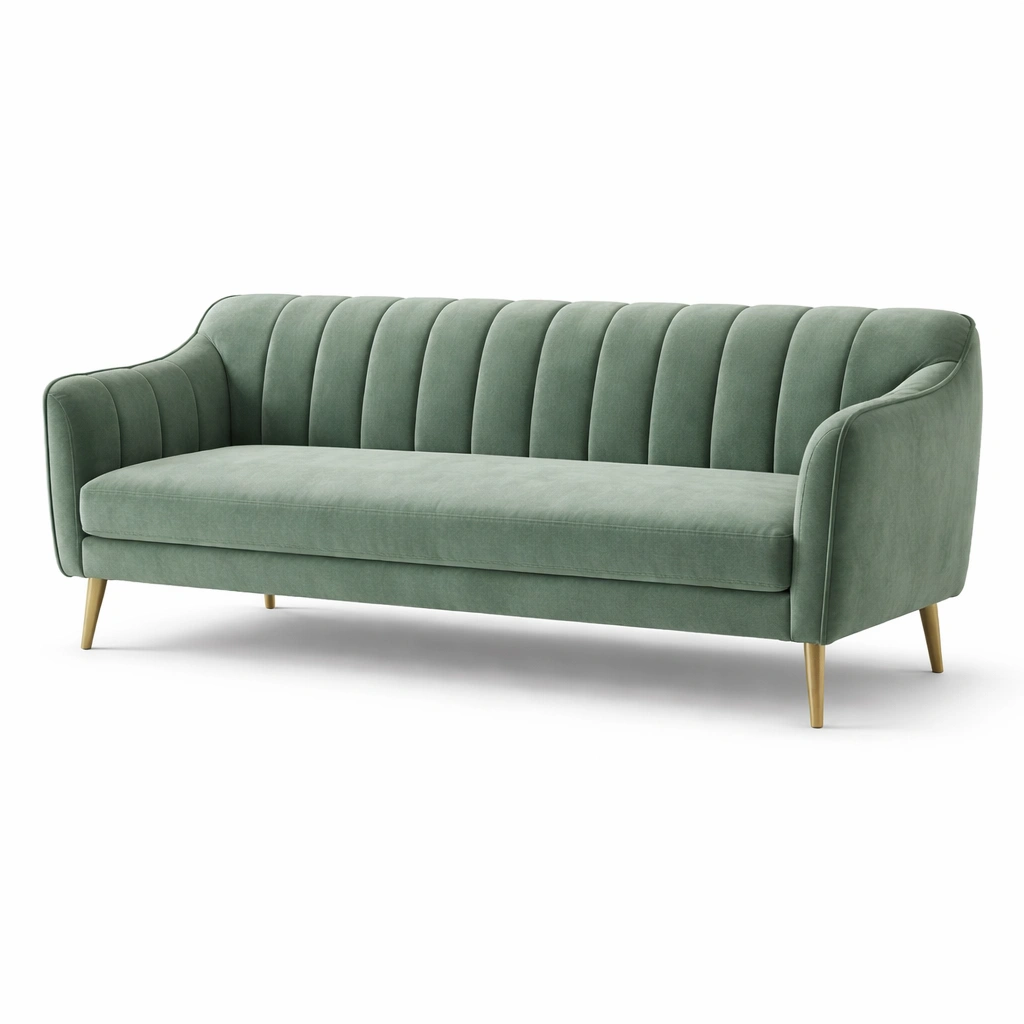 Sofá de tres plazas de terciopelo y patas de madera