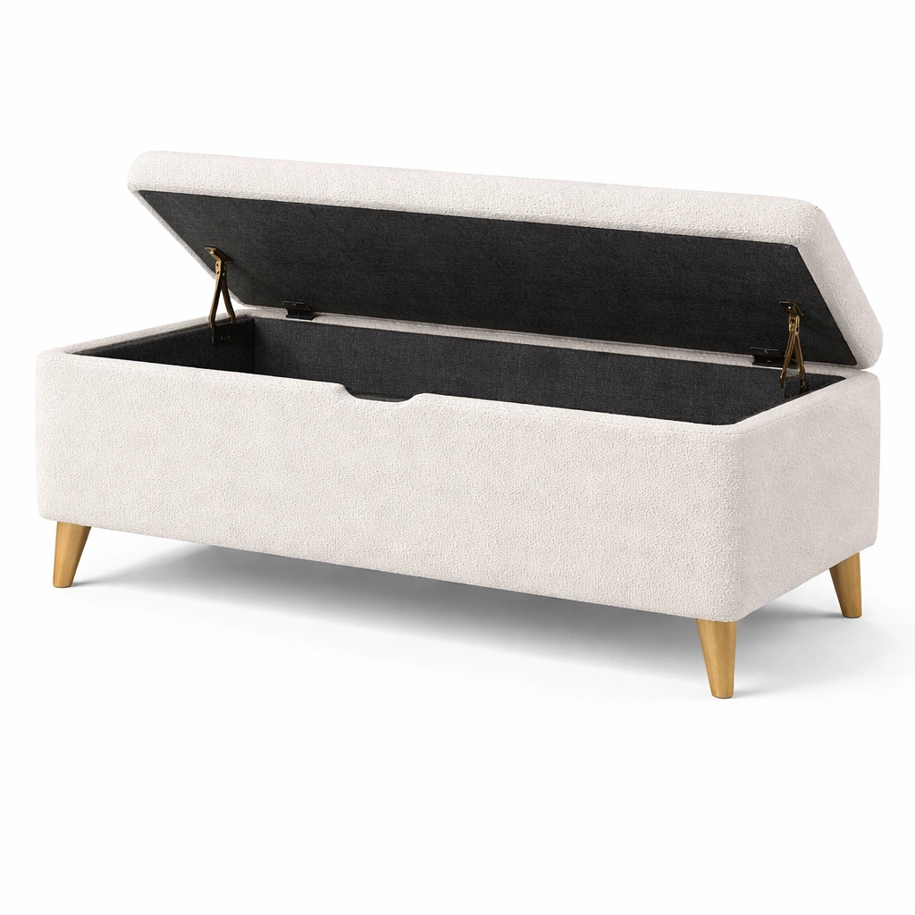 Banco de almacenamiento tapizado en tela de poliéster beige. La estructura está fabricada en madera con patas del mismo material. Dimensiones: 100 cm de largo, 40 cm de ancho y 45 cm de alto.