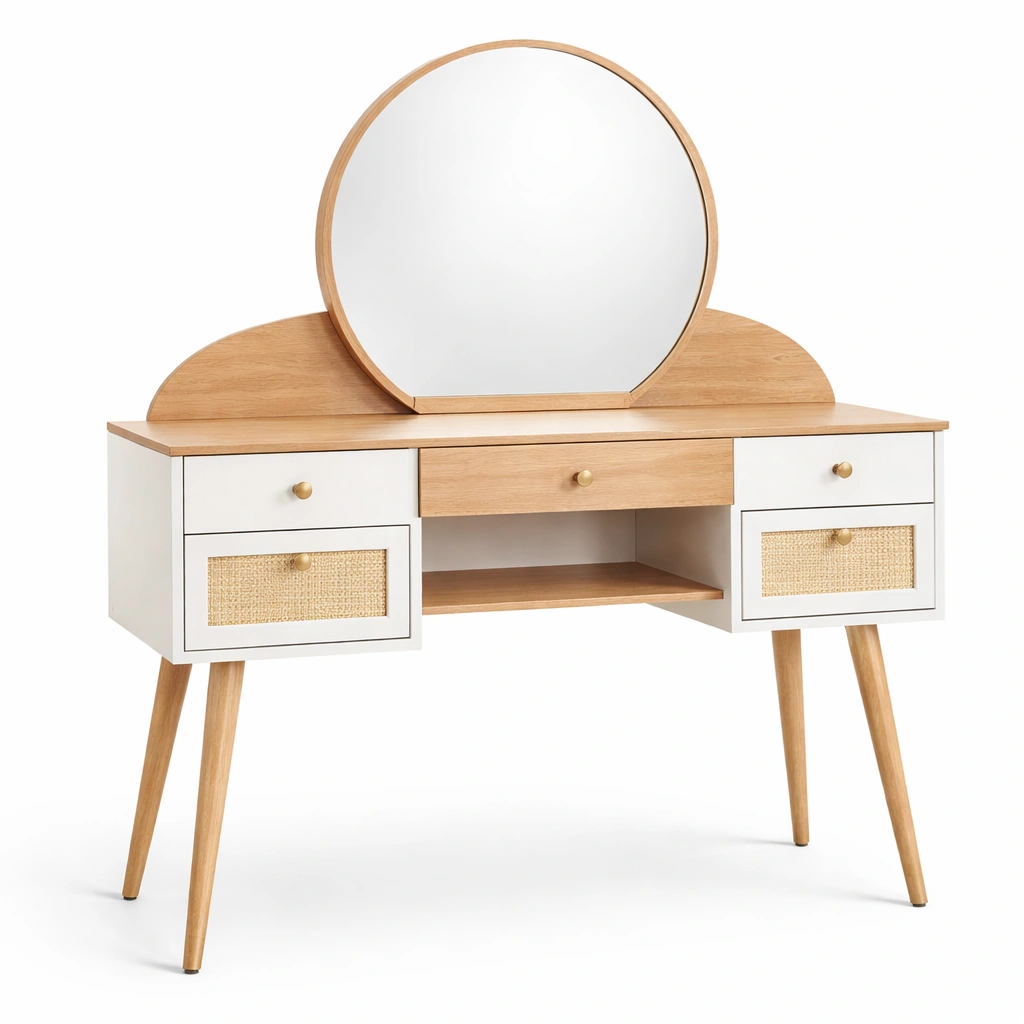 Componentes: Espejo con diámetro de 60 cm, cuatro cajones (dos con frente de ratán tejido).